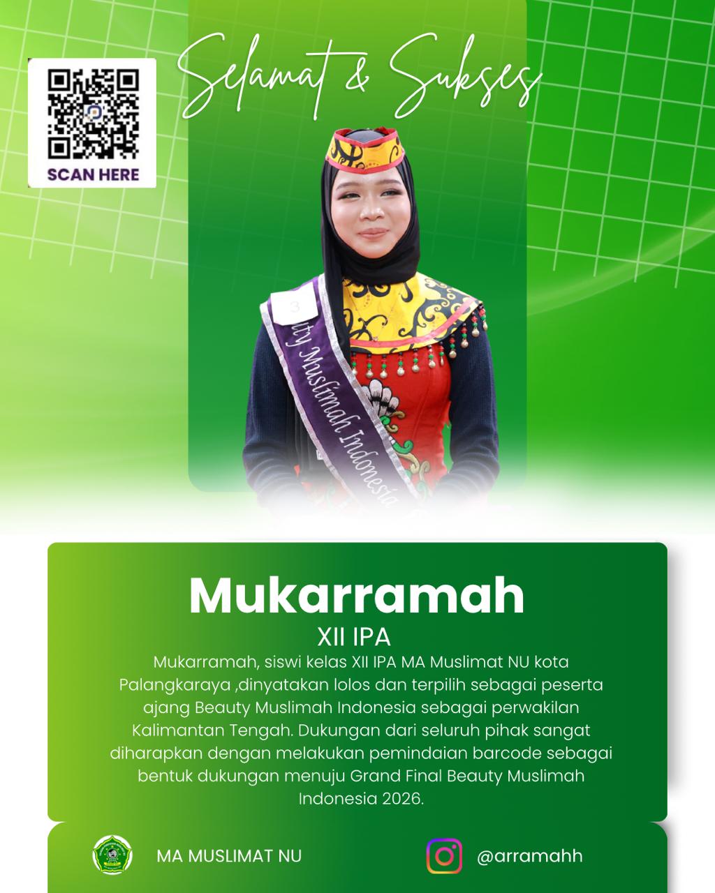 Mukarramah dikenal sebagai sosok muslimah muda yang berprestasi, santun, serta aktif dalam kegiatan sosial dan kemasyarakatan. Ia mampu memadukan nilai-nilai keislaman dengan semangat generasi muda yang berdaya saing, sehingga layak menyandang gelar Beauty Muslimah Indonesia 2025.