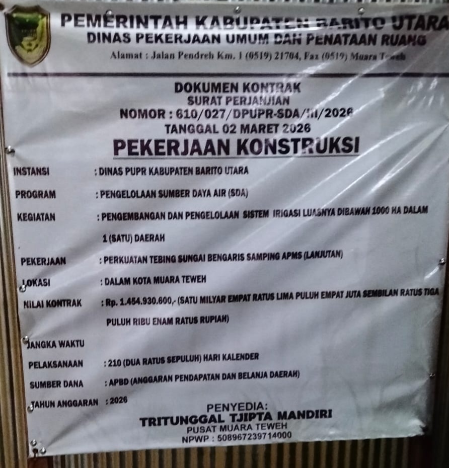 Perkuatan Tebing Sungai Bengaris Samping APMS (Lanjutan) di Muara Teweh, Kabupaten Barito Utara, yang menjadi sorotan setelah muncul dugaan pelarangan peliputan terhadap wartawan saat melakukan investigasi di lapangan.